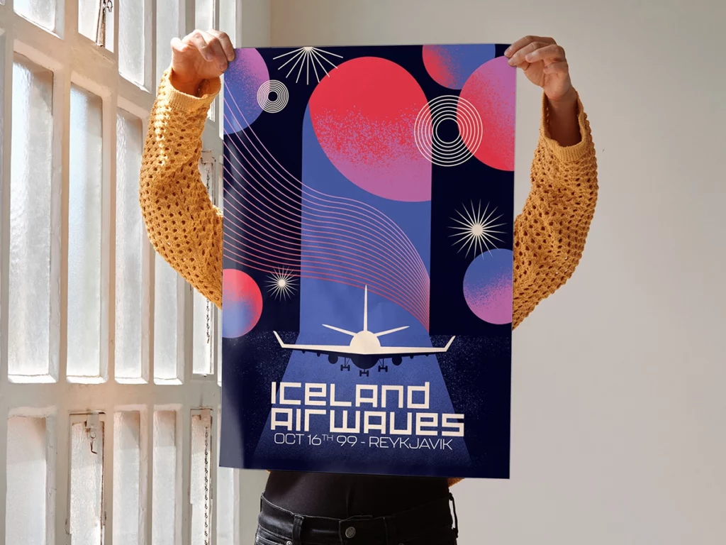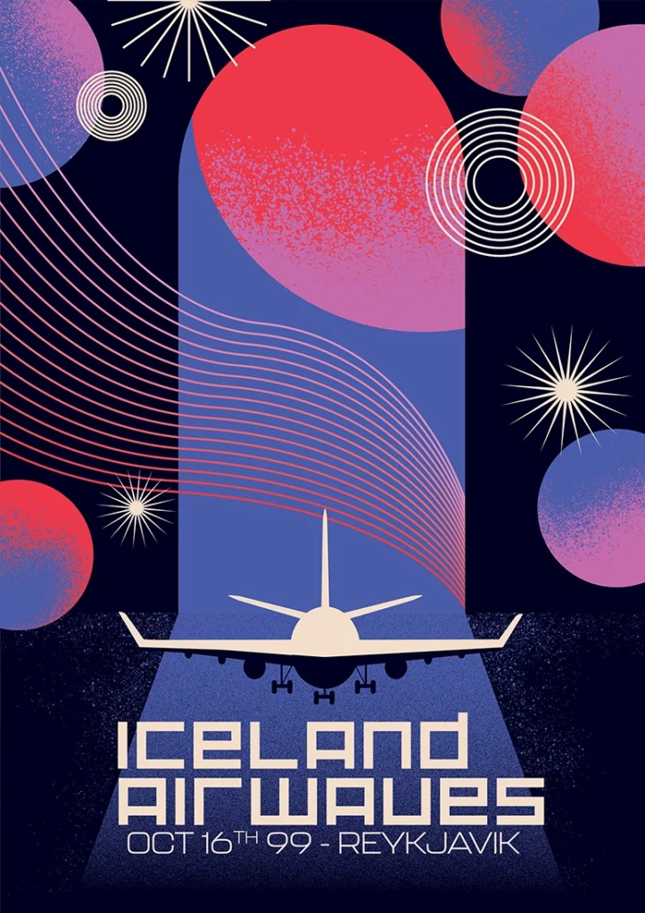 Cette affiche commémorative pour le festival Iceland Airwaves célèbre la première édition du festival qui eut lieu dans un hangar à avions de l’aéroport de Reykjavik le 16 octobre 1999.
